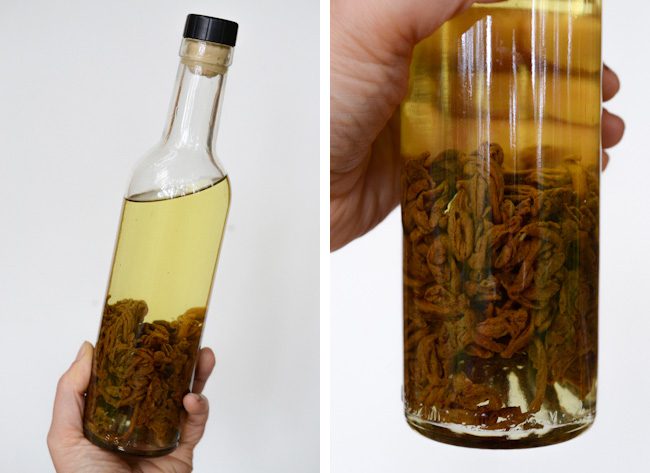 ماده بدست آمده از مرحله قبل را، به مدت ۱۰ دقیقه، در یک حمام آب (مراقب باشید، دما بیش از ۵۰ درجه سانتیگراد نباشد) به آرامی حرارت بدهید(حرارت غیر مستیقم در داخل آب). عصاره بدست آمده را فیلتر کرده و داخل ظروف در بسته ( مهر و موم شده) در تاریکی نگهداری کنید.